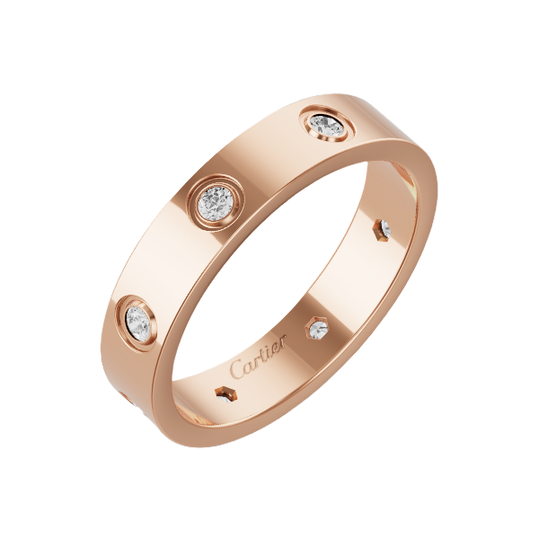 - LOVE 웨딩 링, 750/1000 핑크 골드, 총 0.19캐럿의 브릴리언트 컷 다이아몬드 8개 세팅. 폭: 4mm. (52사이즈)