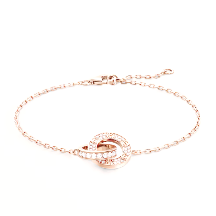 LOVE 브레이슬릿, 750/1000 핑크 골드, 총 0.22캐럿 브릴리언트 컷 다이아몬드 18개 세팅. 폭: 2.65mm. 내부 직경: 7.6mm. 조절 가능한 체인 길이: 160~180mm.