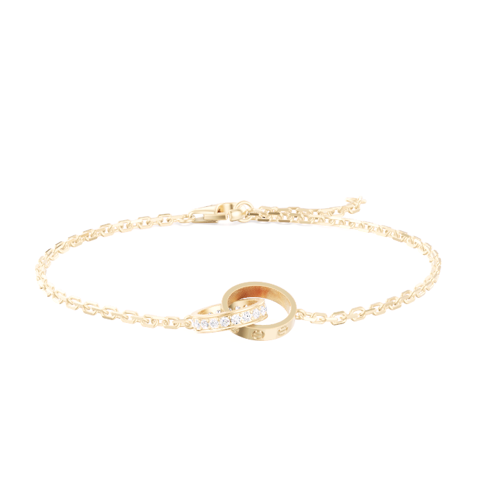 LOVE 브레이슬릿, 750/1000 옐로우 골드, 총 0.22캐럿 브릴리언트 컷 다이아몬드 18개 세팅. 폭: 2.65mm. 내부 직경: 7.6mm. 조절 가능한 체인 길이: 160~180mm.