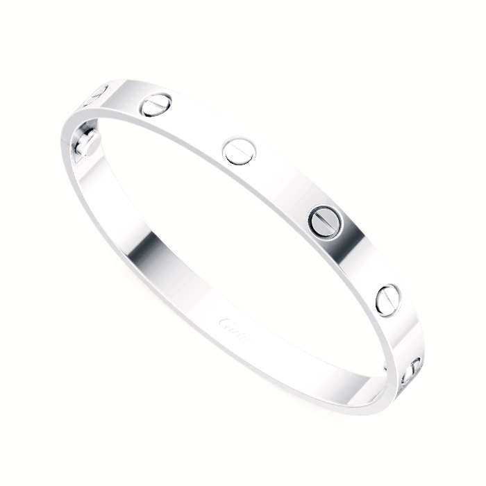 LOVE 브레이슬릿, 750/1000 화이트 골드, 총 2캐럿의 브릴리언트 컷 다이아몬드 204개 세팅. 폭: 6.7mm