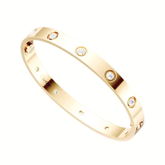 LOVE 브레이슬릿, 클래식 모델, 750/1000 옐로우 골드, 총 0.96캐럿 브릴리언트 컷 다이아몬드 10개 세팅, 2개의 기능성 스크루가 장착된 독창적인 잠금장치 시스템. 스크루 드라이버 포함. 폭 6.1mm.