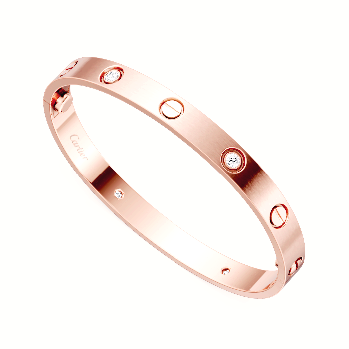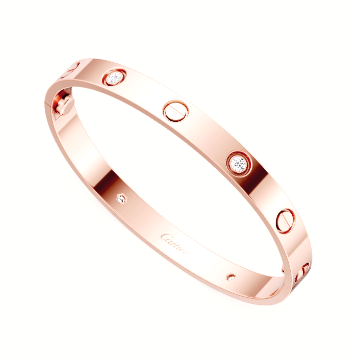 LOVE 브레이슬릿, 클래식 모델, 750/1000 핑크 골드, 총 0.42캐럿 브릴리언트 컷 다이아몬드 4개 세팅, 2개의 기능성 스크루가 장착된 독창적인 잠금장치 시스템. 스크루 드라이버 포함. 폭 6.1mm.