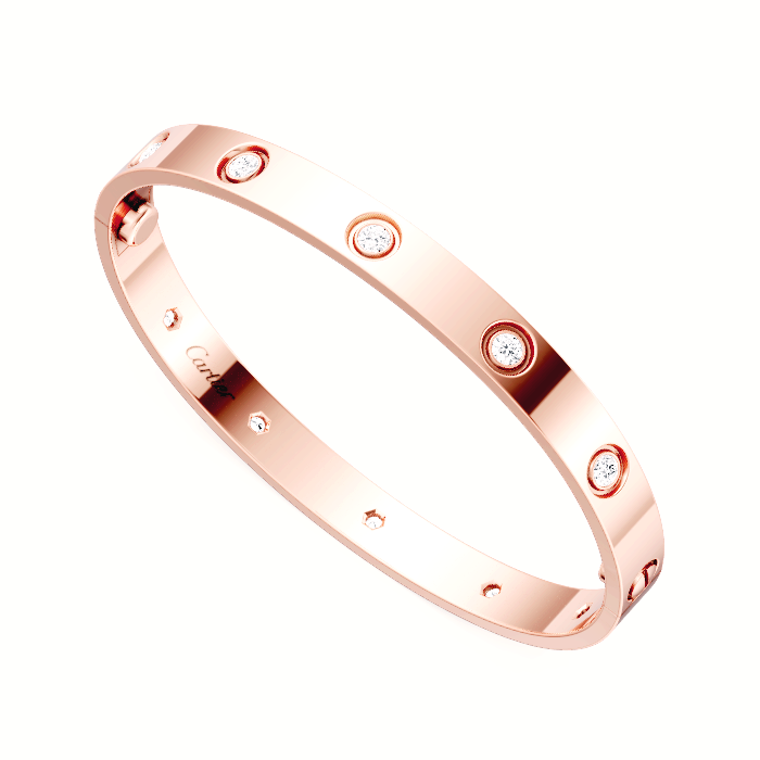 LOVE 브레이슬릿, 클래식 모델, 750/1000 핑크 골드, 총 0.96캐럿 브릴리언트 컷 다이아몬드 10개 세팅, 2개의 기능성 스크루가 장착된 독창적인 잠금장치 시스템. 스크루 드라이버 포함. 폭 6.1mm.
