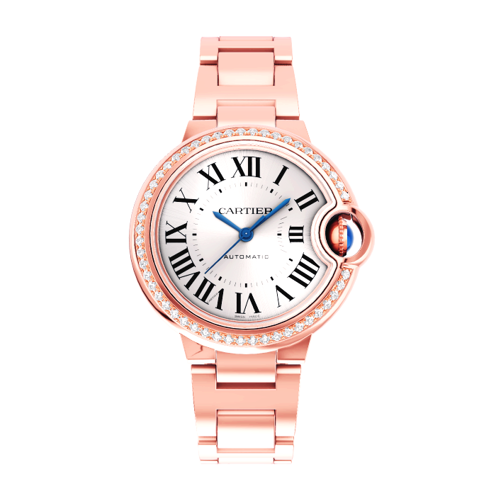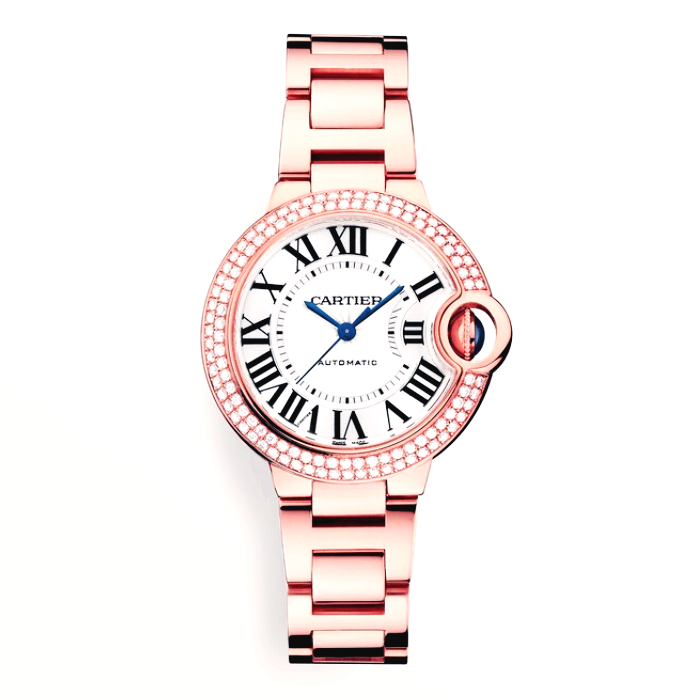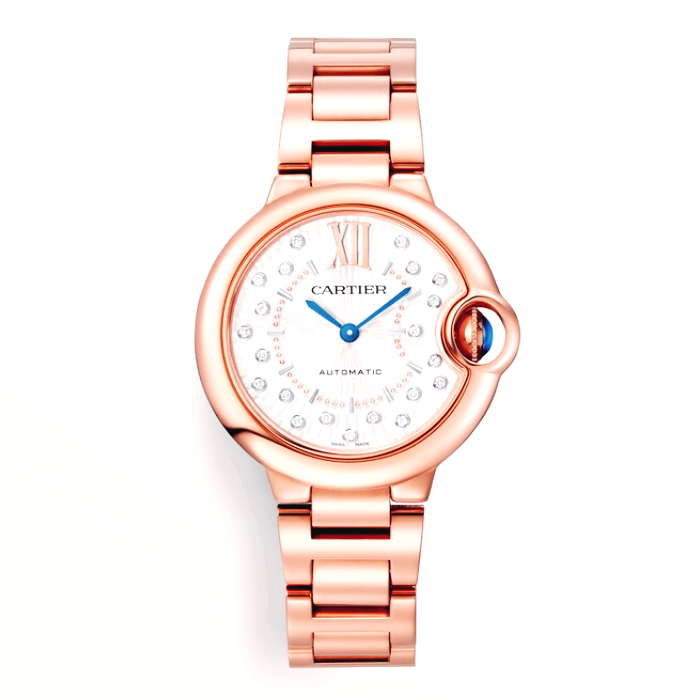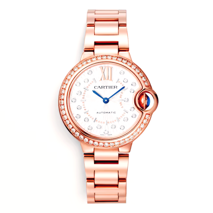 발롱 블루 드 까르띠에 워치, 33mm, 오토매틱 와인딩 메캐니컬 무브먼트. 총 0.94캐럿의 브릴리언트 컷 다이아몬드 115개가 세팅된 750/1000 핑크 골드 케이스. 사파이어 카보숑 1개가 세팅된 플루티드 크라운. 실버 기요쉐 다이얼. 검 모양의 블루 스틸 핸즈. 사파이어 글래스. 교체 가능한 750/1000 핑크 골드 브레이슬릿. 두께: 10.16mm. 3bar(약 30m) 방수.