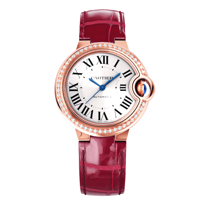 발롱 블루 드 까르띠에 워치, 33mm, 오토매틱 와인딩 메캐니컬 무브먼트. 총 0.68캐럿의 브릴리언트 컷 다이아몬드 47개가 세팅된 750/1000 핑크 골드 케이스. 사파이어 카보숑 1개가 장식된 플루티드 크라운. 실버 마감 태양 광선 모티프 다이얼. 검 모양의 블루 스틸 핸즈. 사파이어 글래스. 버건디 앨리게이터 가죽 스트랩, 750/1000 핑크 골드 아르디옹 버클. 케이스 두께: 10mm. 3bar(30m) 방수.