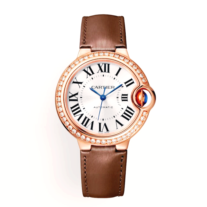 발롱 블루 드 까르띠에 워치, 33mm, 오토매틱 와인딩 메캐니컬 무브먼트. 총 0.68캐럿의 브릴리언트 컷 다이아몬드 47개가 세팅된 750/1000 핑크 골드 케이스. 사파이어 카보숑 1개가 세팅된 플루티드 크라운. 실버 마감 태양 광선 모티프 다이얼. 검 모양의 블루 스틸 핸즈. 사파이어 글래스. 새틴 브러시드 송아지 가죽 브레이슬릿 2개, 버건디 및 브라운, 750/1000 핑크 골드 아르디옹 버클. 케이스 두께: 10mm. 3bar(약 30m) 방수.
