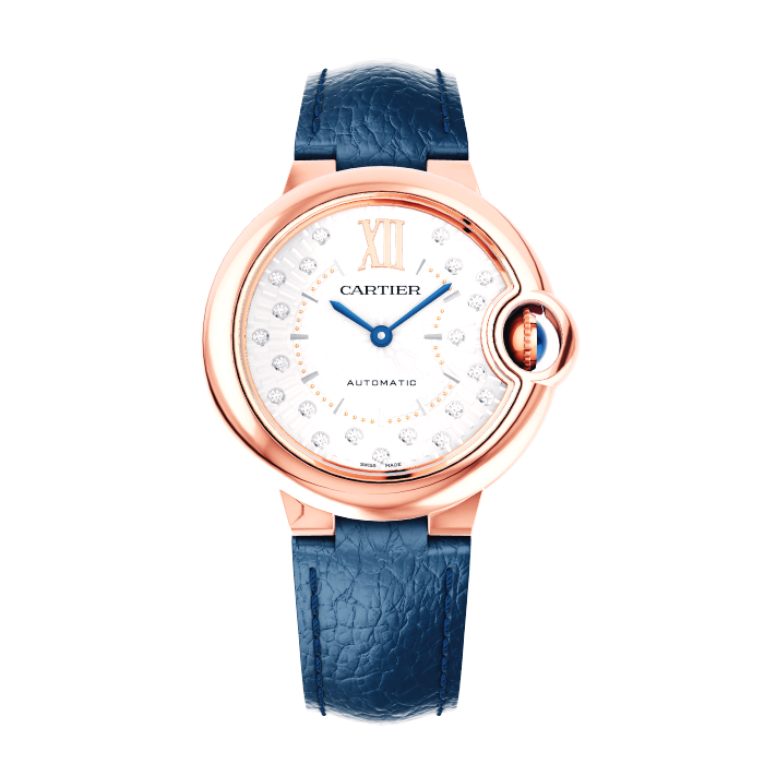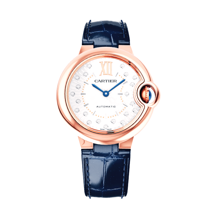 발롱 블루 드 까르띠에 워치, 33mm. 오토매틱 와인딩 메캐니컬 무브먼트. 750/1000 핑크 골드 케이스, 사파이어 카보숑이 세팅된 750/1000 핑크 골드 플루티드 크라운. 총 0.10캐럿의 브릴리언트 컷 다이아몬드 21개가 세팅된 매트 실버 마감 스탬핑 태양 광선 다이얼. 검 모양의 블루 스틸 핸즈. 사파이어 글래스. 블루 앨리게이터 가죽 스트랩, 750/1000 핑크 골드 아르디옹 버클. 두께: 9.96mm. 3bar(약 30m) 방수.
