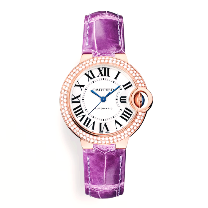 발롱 블루 드 까르띠에 워치, 33mm, 오토매틱 와인딩 메캐니컬 무브먼트. 총 0.94캐럿의 브릴리언트 컷 다이아몬드 115개가 세팅된 750/1000 핑크 골드 케이스. 사파이어 카보숑 1개가 세팅된 플루티드 크라운. 실버 기요쉐 및 래커 처리된 오팔린 다이얼. 검 모양의 블루 스틸 핸즈. 사파이어 글래스. 퍼플 앨리게이터 가죽 스트랩, 교체 가능한 750/1000 핑크 골드 디플로이언트 버클. 두께: 10.16mm. 3bar(약 30m) 방수.