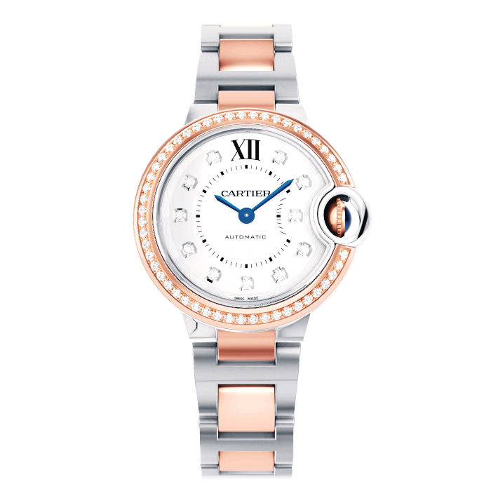 발롱 블루 드 까르띠에 워치, 33mm, 오토매틱 와인딩 메캐니컬 무브먼트. 스틸 케이스, 합성 스피넬 카보숑 1개가 세팅된 750/1000 핑크 골드 플루티드 크라운. 총 0.63캐럿의 브릴리언트 컷 다이아몬드 61개가 세팅된 750/1000 핑크 골드 베젤과 실버 기요쉐 다이얼. 검 모양의 블루 스틸 핸즈. 사파이어 글래스. 교체 가능한 투톤 브레이슬릿. 두께: 10.16mm. 3bar(약 30m) 방수.