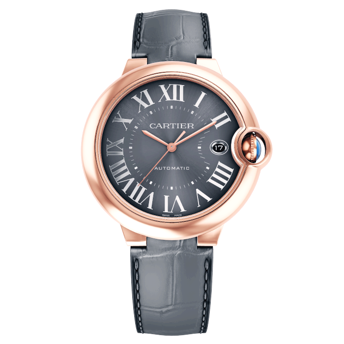발롱 블루 드 까르띠에 워치, 40mm. 오토매틱 와인딩 메캐니컬 무브먼트, 1847 MC 칼리버. 750/1000 핑크 골드 케이스, 사파이어 카보숑 1개가 세팅된 플루티드 크라운, 다크 그레이 태양 광선 모티프 브러시드 다이얼, 검 모양의 750/1000 핑크 골드 핸즈, 사파이어 글래스, 교체 가능한 그레이 앨리게이터 가죽 스트랩, 교체 가능한 750/1000 핑크 골드 디플로이언트 버클, 3시 방향의 캘린더 창. 두께: 12.4mm. 3bar(약 30m) 방수.