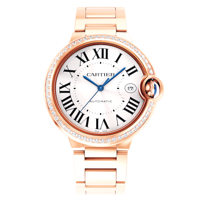 발롱 블루 드 까르띠에 워치, 40mm. 오토매틱 와인딩 메캐니컬 무브먼트, 1847 MC 칼리버. 총 1.06캐럿의 브릴리언트 컷 다이아몬드 52개가 세팅된 750/1000 핑크 골드 케이스, 카보숑 사파이어가 세팅된 플루티드 크라운, 실버 마감 태양 광선 모티프 브러시드 다이얼, 검 모양의 블루 스틸 핸즈, 사파이어 글래스, 교체 가능한 750/1000 핑크 골드 브레이슬릿, 3시 방향의 캘린더 창. 두께: 12.4mm. 3bar(약 30m) 방수.