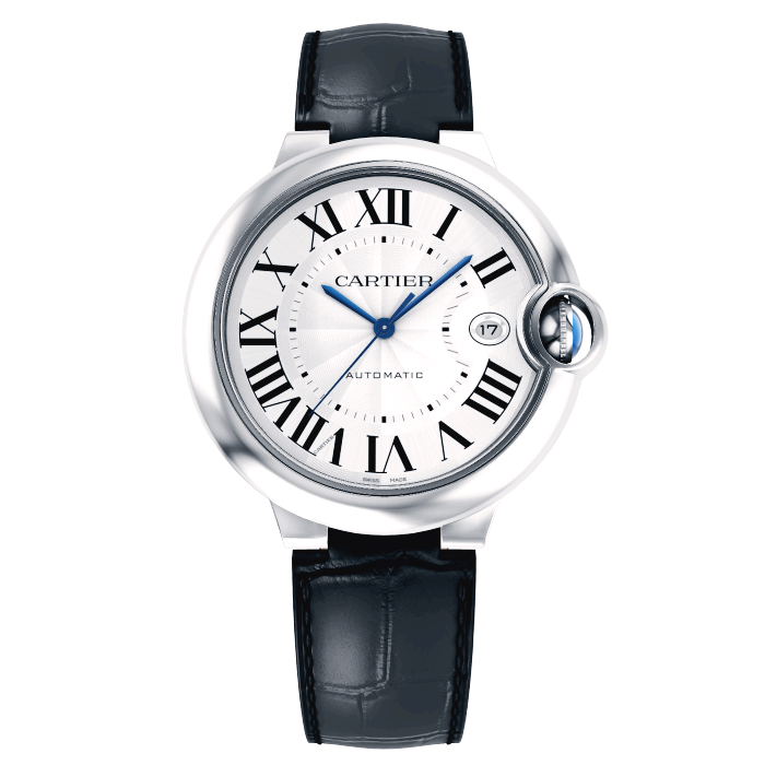 발롱 블루 드 까르띠에 워치, 40mm. 오토매틱 와인딩 메캐니컬 무브먼트, 1847 MC 칼리버. 스틸 케이스, 카보숑형 합성 스피넬이 세팅된 플루티드 크라운, 실버 마감 기요쉐 다이얼, 검 모양의 블루 스틸 핸즈, 사파이어 글래스, 교체 가능한 블랙 그레인 앨리게이터 가죽 브레이슬릿, 교체 가능한 스틸 디플로이언트 버클, 3시 방향의 캘린더 창. 두께: 12.4mm. 3bar(약 30m) 방수.