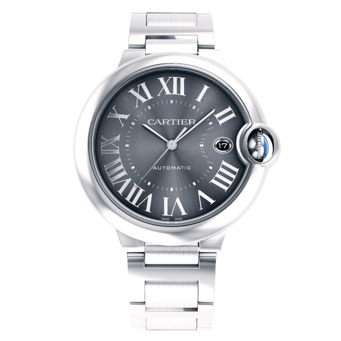 발롱 블루 드 까르띠에 워치, 40mm, 오토매틱 와인딩 메캐니컬 무브먼트, 1847 MC 칼리버. 스틸 케이스, 카보숑형 합성 스피넬 1개를 세팅한 플루티드 크라운, 태양 광선 모티프 브러시드 다크 그레이 다이얼, 검 모양의 실버 마감 핸즈, 사파이어 글래스, 교체 가능한 스틸 브레이슬릿, 3시 방향의 캘린더 창. 두께: 12.4mm. 3bar(약 30m) 방수.