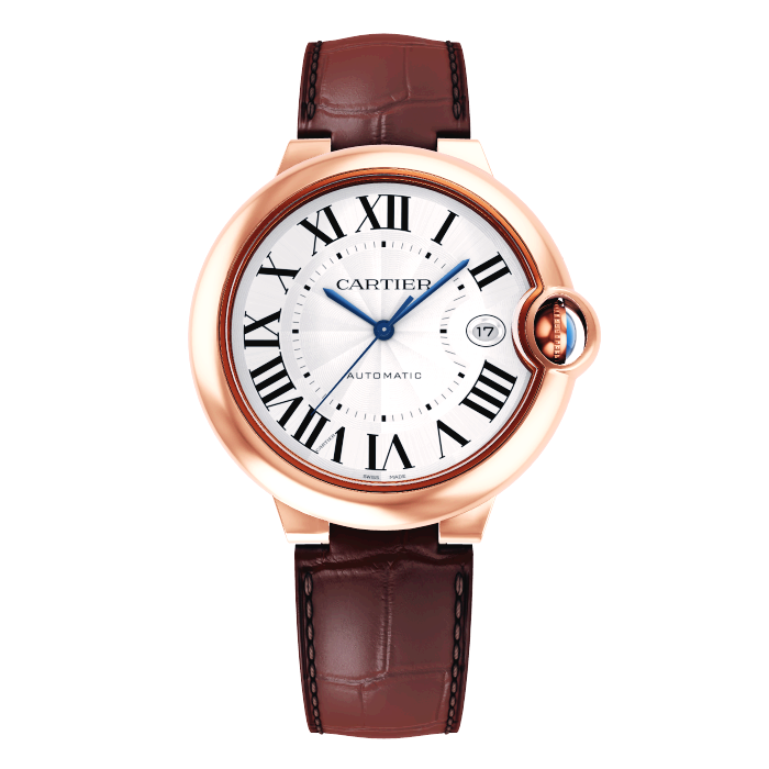 발롱 블루 드 까르띠에 워치, 40mm. 오토매틱 와인딩 메캐니컬 무브먼트, 1847 MC 칼리버. 총 1.06캐럿의 브릴리언트 컷 다이아몬드 52개가 세팅된 750/1000 핑크 골드 케이스, 사파이어 카보숑이 세팅된 플루티드 크라운, 실버 마감 태양 광선 모티프 브러시드 다이얼, 검 모양의 블루 스틸 핸즈, 사파이어 글래스, 버건디 앨리게이터 가죽 스트랩, 750/1000 핑크 골드 아르디옹 버클, 3시 방향의 캘린더 창. 두께: 12.4mm. 3bar(약 30m) 방수.