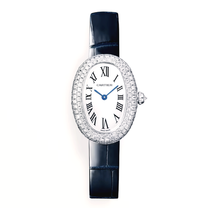 베누아 워치, small 모델, 쿼츠 무브먼트. 총 2.33캐럿의 브릴리언트 컷 다이아몬드 228개가 세팅된 750/1000 화이트 골드 케이스와 비즈 크라운. 실버 마감 다이얼, 검 모양의 블루 스틸 핸즈, 사파이어 글래스. 네이비 블루 앨리게이터 가죽 스트랩, 로듐 도금 750/1000 화이트 골드 아르디옹 버클. 크기: 32mm x 26mm. 두께: 8mm. 3bar(약 30m) 방수.