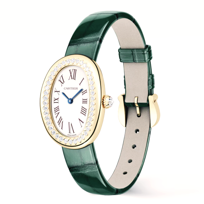 베누아 드 까르띠에 워치, small 모델, 쿼츠 무브먼트. 총 0.48캐럿의 브릴리언트 컷 다이아몬드 42개가 세팅된 750/1000 옐로우 골드 케이스. 0.08캐럿의 다이아몬드 카보숑 1개가 세팅된 750/1000 옐로우 골드 비즈 크라운. 실버 마감 다이얼, 검 모양의 블루 스틸 핸즈, 사파이어 글래스. 바니시 그린 앨리게이터 가죽 스트랩, 750/1000 옐로우 골드 아르디옹 버클. 길이: 31.4mm, 폭: 23.09mm, 두께: 6.95mm. 3bar(약 30m) 방수.