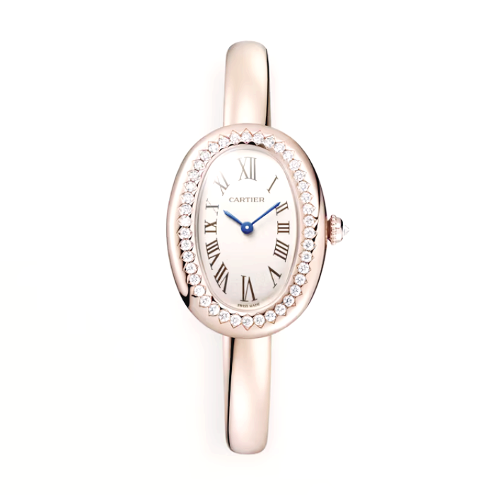 베누아 드 까르띠에 워치, 스몰(small) 모델, 15사이즈, 쿼츠 무브먼트. 총 0.48캐럿 브릴리언트 컷 다이아몬드 42개를 세팅한 750/1000 핑크 골드 케이스. 총 0.08캐럿 다이아몬드 1개를 세팅한 750/1000 핑크 골드 비즈 크라운. 실버 마감 다이얼, 검 모양의 블루 스틸 핸즈, 사파이어 글래스. 길이: 31.4mm, 폭: 23.1mm, 두께: 6.9mm. 3bar(약 30m) 방수.