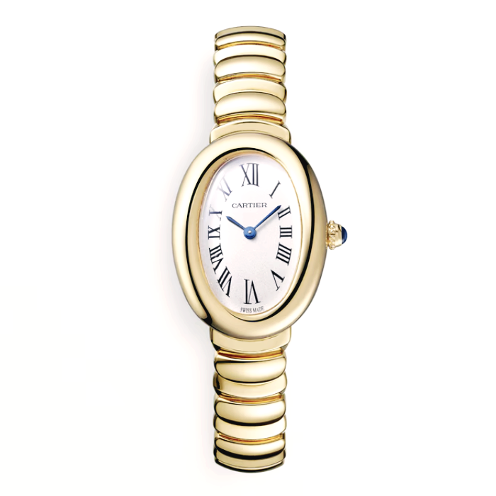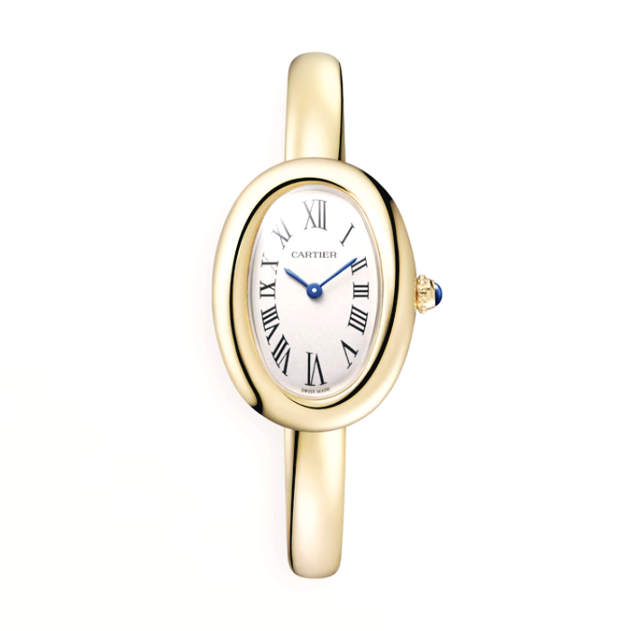 베누아 드 까르띠에 워치, 스몰(small) 모델, 16 사이즈, 쿼츠 무브먼트. 750/1000 옐로우 골드 케이스. 사파이어 카보숑 1개를 세팅한 750/1000 옐로우 골드 비즈 크라운. 견고한 750/1000 옐로우 골드 브레이슬릿. 실버 마감 다이얼, 검 모양의 블루 스틸 핸즈, 사파이어 글래스. 길이: 31.4mm, 폭: 23.1mm, 두께: 6.9mm. 3bar(약 30m) 방수.