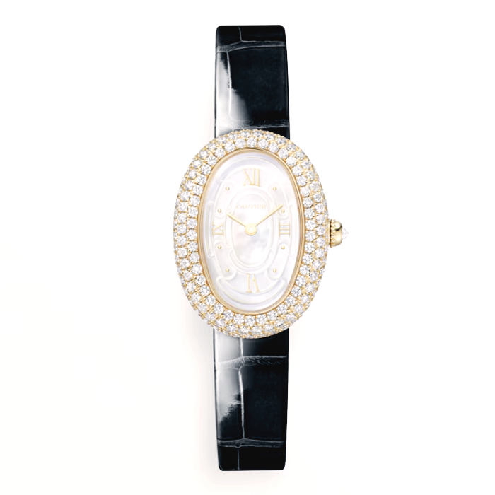 베누아 드 까르띠에 워치, 스몰(small) 모델, 쿼츠 무브먼트. 총 2.25캐럿 브릴리언트 컷 다이아몬드 227개를 세팅한 750/1000 옐로우 골드 케이스. 총 0.08캐럿 다이아몬드 1개를 세팅한 750/1000 옐로우 골드 비즈 크라운. 자개 다이얼, 검 모양의 옐로우 골드 피니싱 핸즈, 사파이어 글래스. 바니시 블랙 앨리게이터 가죽 스트랩, 750/1000 옐로우 골드 아르디옹 버클 길이: 31.4mm, 폭: 23.1mm, 두께: 6.9mm. 3bar(약 30m) 방수.