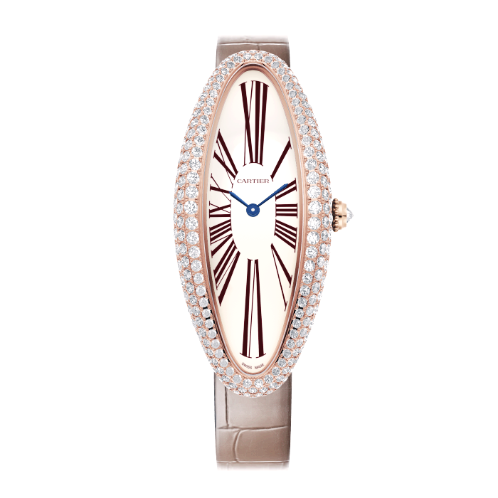베누아 알롱제 워치, medium 모델, 까르띠에 매뉴팩처 매뉴얼 와인딩 메캐니컬 무브먼트, 1917 MC 칼리버. 총 2.67캐럿의 브릴리언트 컷 다이아몬드 267개가 세팅된 750/1000 핑크 골드 케이스와 비즈 크라운. 실버 마감 다이얼, 검 모양의 블루 스틸 핸즈, 사파이어 글래스. 토프 앨리게이터 가죽 스트랩, 750/1000 핑크 골드 아르디옹 버클. 크기: 47mm x 21mm. 두께: 8mm. 3bar(약 30m) 방수.