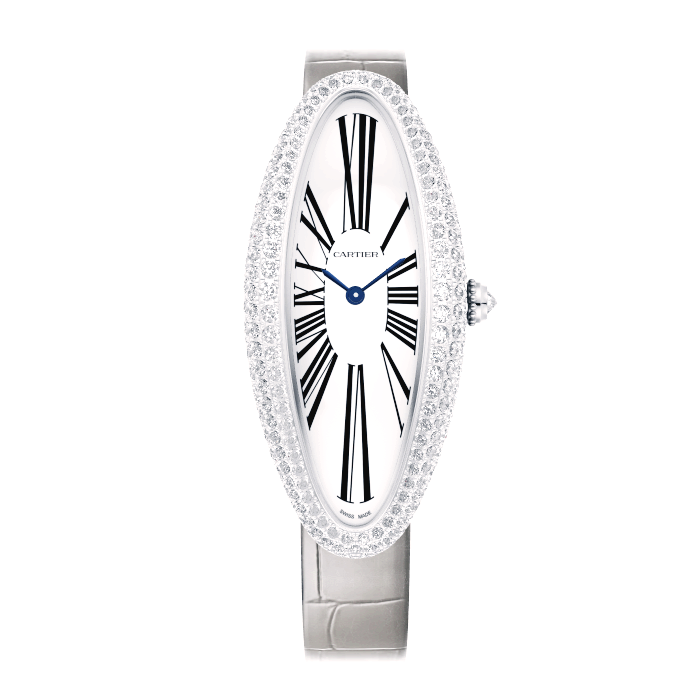 베누아 알롱제 워치, medium 모델, 까르띠에 매뉴팩처 매뉴얼 와인딩 메캐니컬 무브먼트, 1917 MC 칼리버. 총 2.67캐럿의 브릴리언트 컷 다이아몬드 267개가 세팅된 로듐 도금 750/1000 화이트 골드 케이스와 비즈 크라운. 실버 마감 다이얼, 검 모양의 블루 스틸 핸즈, 사파이어 글래스. 라이트 그레이 앨리게이터 가죽 스트랩, 로듐 도금 750/1000 화이트 골드 아르디옹 버클. 크기: 47mm x 21mm. 두께: 8mm. 3bar(약 30m) 방수.