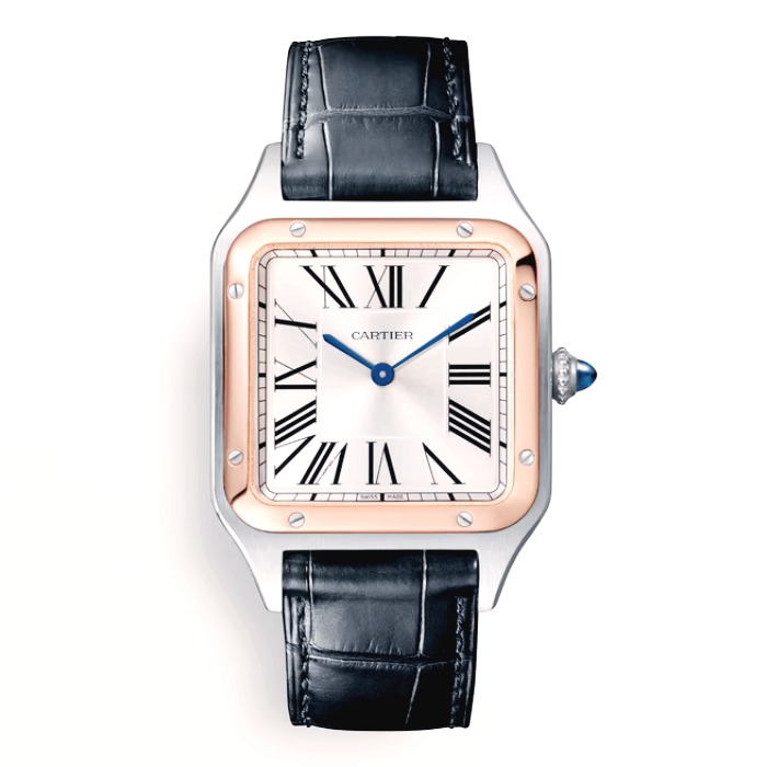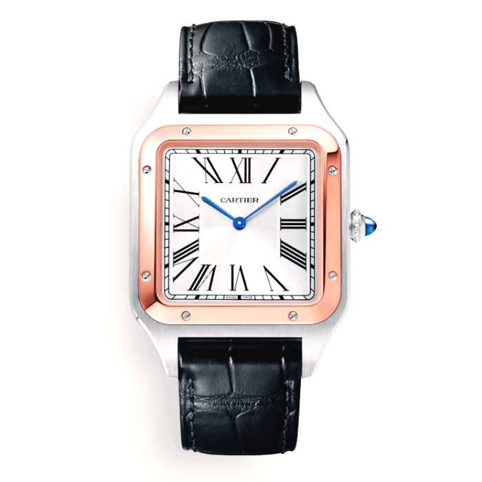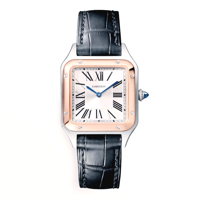 산토스 뒤몽 워치, large 모델, 고주파 쿼츠 무브먼트 (연속 작동 시간, 약 6년). 스틸 케이스, 750/1000 핑크 골드 베젤, 카보숑형 블루 합성 스피넬이 세팅된 스틸 비즈 크라운, 태양 광선 모티프 새틴 브러시드 실버 다이얼, 로마 숫자, 검 모양의 블루 스틸 핸즈, 사파이어 글래스, 블랙 앨리게이터 가죽 스트랩, 스틸 아르디옹 버클. 케이스 크기: 43.5mm x 31.4mm, 두께: 7.3mm. 3bar(약 30m) 방수.