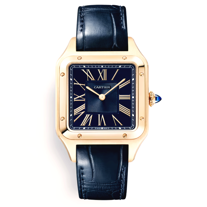 산토스 뒤몽 워치, large 모델, 쿼츠 무브먼트. 750/1000 옐로우 골드 케이스, 카보숑형 합성 블루 스피넬이 세팅된 비즈 크라운, 태양 광선 모티프 새틴 브러시드 블루 다이얼, 골드 로마 숫자, 검 모양의 골드 피니싱 스틸 핸즈, 사파이어 글래스, 블루 앨리게이터 가죽 스트랩, 750/1000 옐로우 골드 아르디옹 버클. 케이스 크기: 43.5mm x 31.4mm, 두께: 7.3mm. 3bar(약 30m) 방수.