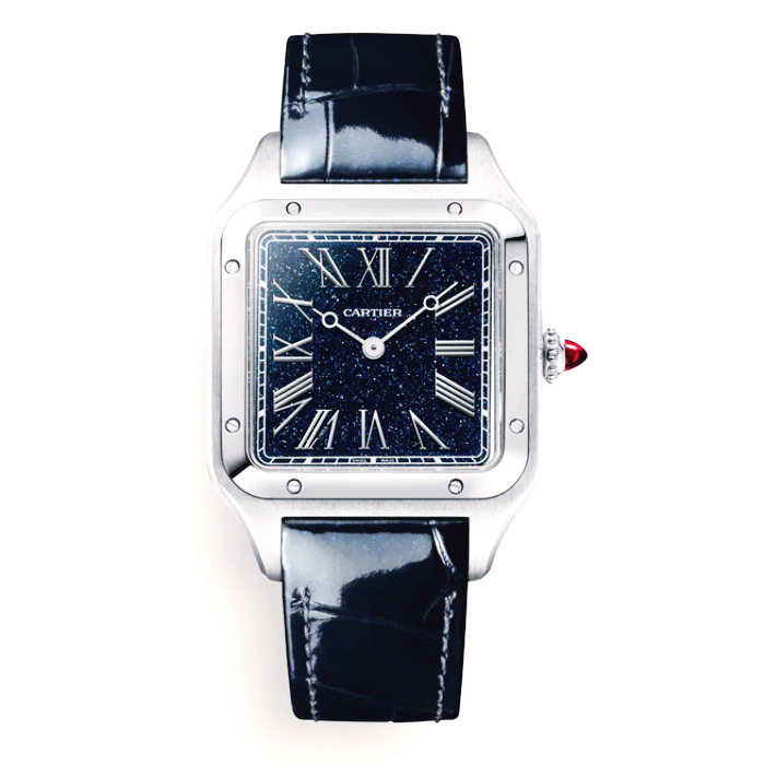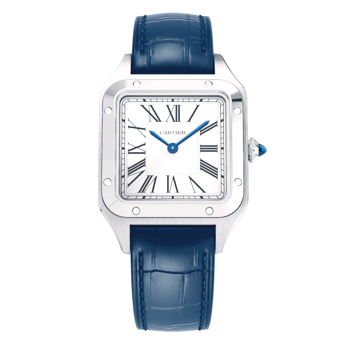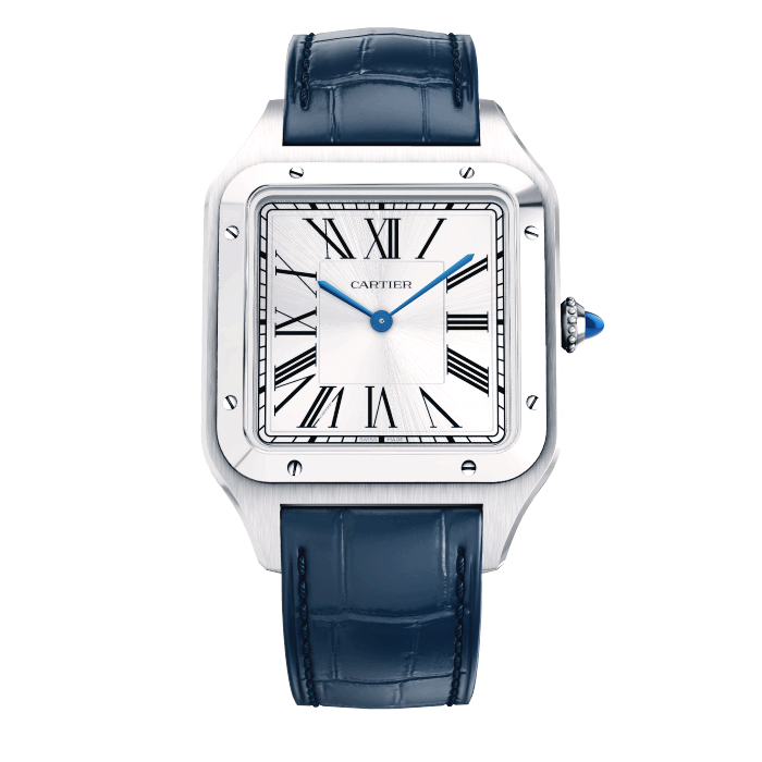 산토스 뒤몽 워치, extra-large 모델, 까르띠에 매뉴팩처 매뉴얼 와인딩 메케니컬 무브먼트, 430 MC 칼리버. 스틸 케이스, 블루 합성 스피넬 카보숑 1개가 세팅된 비즈 스틸 크라운, 실버 새틴 피니싱 태양 광선 모티프 다이얼, 로마 숫자, 검 모양의 블루 스틸 핸즈, 사파이어 글래스. 네이비 블루 앨리게이터 가죽 스트랩, 스틸 아르디옹 버클. 케이스 사이즈: 46.6mm x 33.9mm, 두께: 7.5mm. 3bar(약 30m) 방수.
