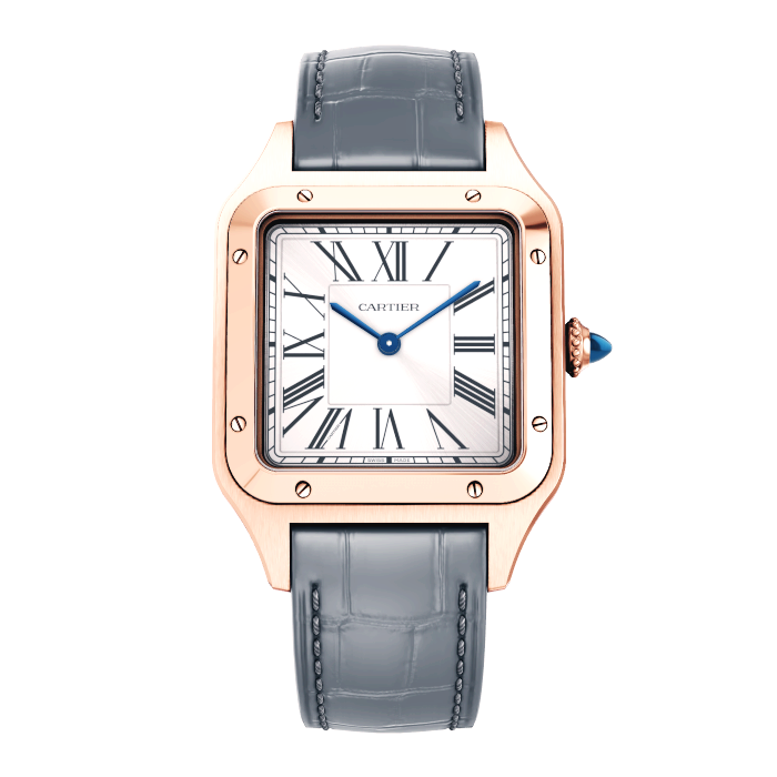 산토스 뒤몽 워치, extra-large 모델, 까르띠에 매뉴팩처 매뉴얼 와인딩 메캐니컬 무브먼트, 430 MC 칼리버. 750/1000 핑크 골드 케이스, 사파이어 카보숑 1개가 세팅된 비즈 크라운, 실버 새틴 피니싱 태양 광선 모티프 다이얼, 로마 숫자, 검 모양의 블루 스틸 핸즈, 사파이어 글래스. 그레이 앨리게이터 가죽 스트랩, 750/1000 핑크 골드 아르디옹 버클. 케이스 사이즈: 46.6mm x 33.9mm, 두께: 7.5mm. 3bar(약 30m) 방수.