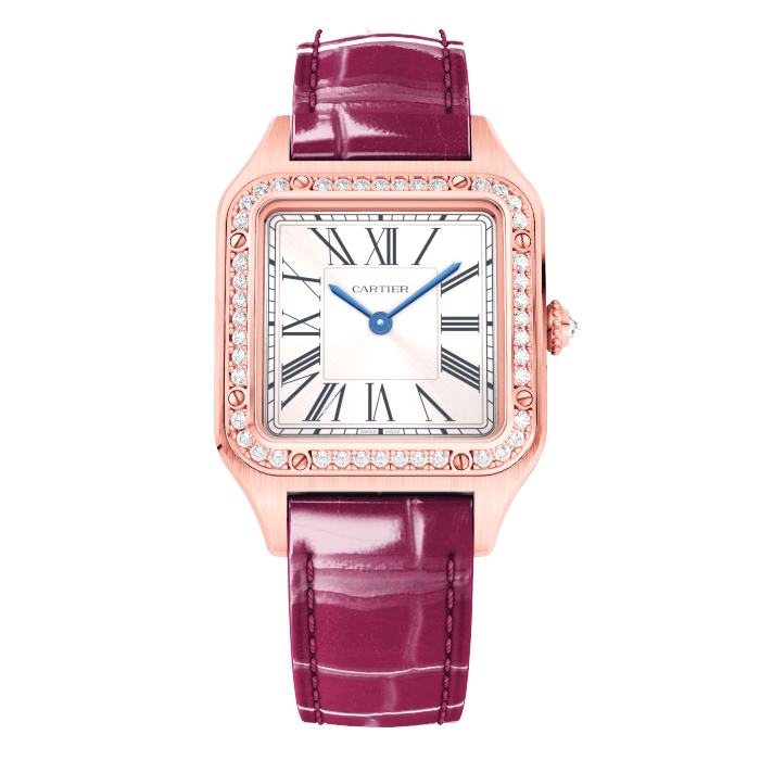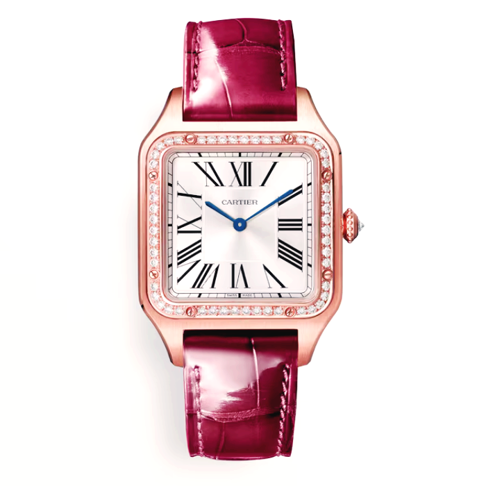 산토스 뒤몽 워치, large 모델, 고주파 쿼츠 무브먼트 (연속 작동 시간, 약 6년). 750/1000 핑크 골드 케이스, 52개의 브릴리언트 컷 다이아몬드가 세팅된 베젤, 1개의 브릴리언트 컷 다이아몬드가 세팅된 비즈 크라운, 총 0.66캐럿. 새틴 브러시드 실버 태양 광선 다이얼, 로마 숫자, 검 모양의 블루 스틸 핸즈, 사파이어 글래스. 버건디 유광 앨리게이터 가죽 스트랩, 750/1000 핑크 골드 아르디옹 버클. 케이스 사이즈: 43.5mm x 31.4mm, 두께: 7.3mm. 3bar(약 30m) 방수.