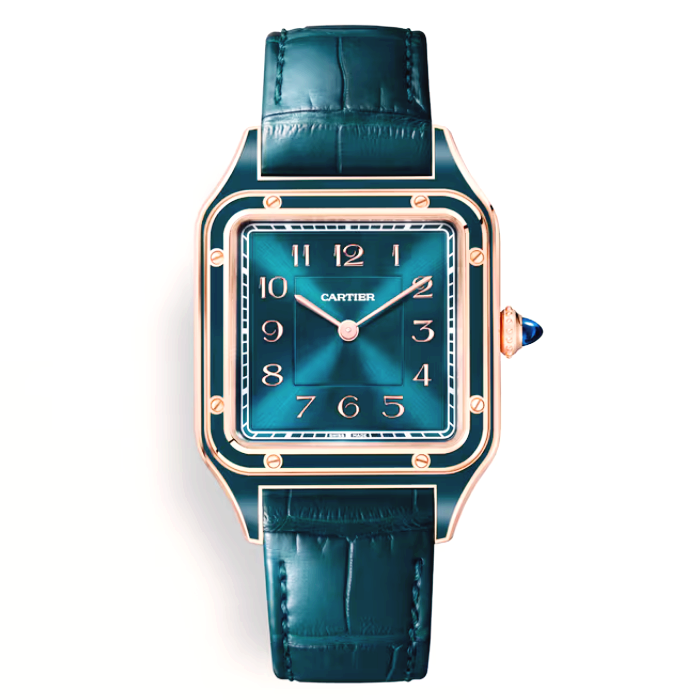 산토스 뒤몽 워치, 라지(large) 모델, 매뉴얼 와인딩 메캐니컬 무브먼트 430 MC. 750/1000 핑크 골드 케이스, 블루 카보숑형 사파이어 1개를 세팅한 비즈 크라운, 래커 처리한 태양 광선 모티프 브러시드 피콕 블루 다이얼, 아라비아 숫자, 검 모양의 골드 피니싱 폴리싱 스틸 핸즈, 사파이어 글래스. 알베르토 산토스-뒤몽의 자필 서명이 인그레이빙된 케이스백. 블루 앨리게이터 가죽 스트랩, 750/1000 핑크 골드 아르디옹 버클. 케이스 크기: 43.5 mm x 31.4 mm, 두께: 7.3 mm. 3bar(약 30m) 방수.