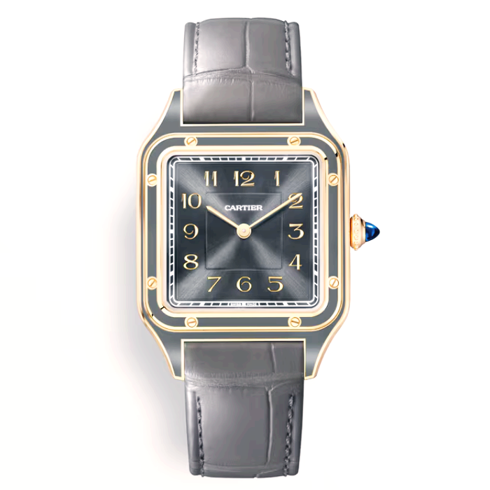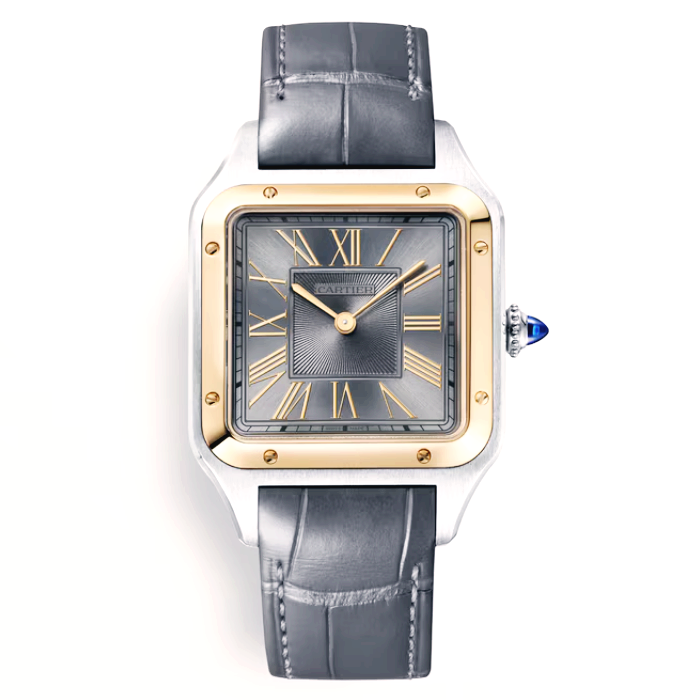 산토스 뒤몽 워치, large 모델, 쿼츠 무브먼트. 스틸 케이스, 750/1000 옐로우 골드 베젤, 카보숑형 합성 블루 스피넬 1개가 세팅된 비즈 크라운, 태양 광선 모티프 새틴 브러시드 그레이 다이얼, 골드 로마 숫자, 검 모양의 폴리싱 골드 피니싱 스틸 핸즈, 사파이어 글래스, 그레이 앨리게이터 가죽 스트랩, 스틸 아르디옹 버클. 케이스 크기: 43.5mm x 31.4mm, 두께: 7.3mm. 3bar(약 30m) 방수.