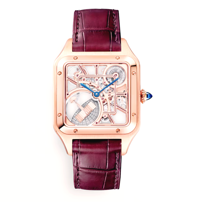 산토스 뒤몽 마이크로 로터 스켈레톤 워치, 라지(large) 모델, 31mm, 오토매틱 메캐니컬 무브먼트, 9629 MC. 750/1000 핑크 골드 케이스, 검 모양의 블루 폴리싱 스틸 핸즈, 사파이어 글래스 및 케이스백, 버건디 래커 장식 브리지 버건디 앨리게이터 가죽 스트랩 및 브라운 앨리게이터 가죽 스트랩, 750/1000 핑크 골드 아르디옹 버클. 무브먼트 크기: 23.2mm, 무브먼트 두께: 4.4mm, 진동수: 시간당 25,200회, 파워 리저브: 약 46시간. 케이스 크기: 31mm, 두께: 8mm. 3bar(약 30m) 방수.