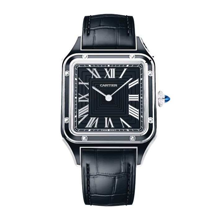 산토스 뒤몽 워치, large 모델, 까르띠에 매뉴팩처 매뉴얼 와인딩 메캐니컬 무브먼트, 430 MC 칼리버. 스틸 케이스, 블랙 래커 장식, 블루 합성 스피넬 카보숑 1개가 세팅된 스틸 비즈 크라운, 반투명 래커 마감 블랙 스퀘어 장식 다이얼, 로마 숫자, 검 모양의 스틸 핸즈, 사파이어 글래스. 알베르토 산토스-뒤몽의 자필 서명이 인그레이빙된 케이스백. 블랙 앨리게이터 가죽 스트랩, 스틸 아르디옹 버클. 케이스 크기: 43.5mm x 31.4mm, 두께: 7.3mm. 3bar(약 30m) 방수.