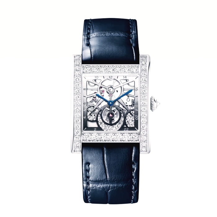탱크 노말 워치, 스켈레톤, 까르띠에 매뉴팩처 매뉴얼 와인딩 메캐니컬 무브먼트, 9628 MC 칼리버. 총 1.95캐럿의 브릴리언트 컷 다이아몬드 42개가 세팅된 950/1000 플래티늄 케이스 및 0.12캐럿의 브릴리언트 컷 다이아몬드 1개가 세팅된 비즈 크라운. 검 모양의 블루 폴리싱 스틸 핸즈, 사파이어 케이스백 및 글래스. 블루 및 다크 블루 앨리게이터 가죽 스트랩 2개, 총 0.20캐럿의 다이아몬드 25개가 세팅된 950/1000 플래티늄 아르디옹 버클. 시/분, 24시간 데이/나이트 인디케이터. 150개(21개의 루비 포함)의 부품으로 구성된 무브먼트. 무브먼트 크기: 22.38mm x 22.38mm, 무브먼트 두께: 3.9mm, 진동수: 시간당 21,600회, 파워 리저브: 약 38시간. 케이스 크기: 35.2mm x 27.8mm, 두께: 8.15mm. 고유번호가 부여된 20피스 리미티드 에디션. 방수 기능 없음