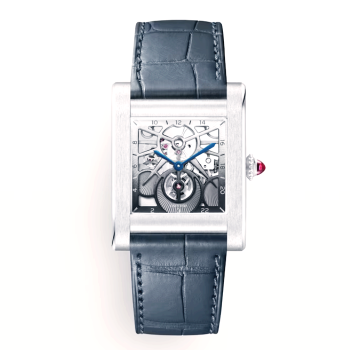 탱크 노말 워치, 스켈레톤, 까르띠에 매뉴팩처 매뉴얼 와인딩 메캐니컬 무브먼트, 9628 MC 칼리버. 950/1000 플래티늄 케이스, 루비 1개가 세팅된 950/1000 플래티늄 크라운, 검 모양의 블루 폴리싱 스틸 핸즈, 사파이어 케이스백 및 글래스. 그레이 앨리게이터 가죽 스트랩 및 버건디 앨리게이터 가죽 스트랩, 950/1000 플래티늄 아르디옹 버클. 시/분, 24시간 데이/나이트 인디케이터 150개(21개의 루비 포함)의 부품으로 구성된 무브먼트. 무브먼트 크기: 22.38mm x 22.38mm, 무브먼트 두께: 3.9mm, 진동수: 시간당 21,600회, 파워 리저브: 약 36시간. 케이스 크기: 35.2mm x 27.8mm, 두께: 8.15mm. 고유번호가 부여된 50피스 리미티드 에디션. 방수 기능 없음