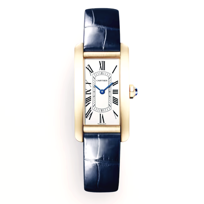 탱크 아메리칸 워치, 스몰(small) 모델, 오랜 수명의 쿼츠 무브먼트. 750/1000 옐로우 골드 케이스, 각면 사파이어 1개를 세팅한 각면 크라운. 새틴 브러시드 실버 마감 다이얼, 검 모양의 블루 스틸 핸즈, 사파이어 글래스. 샤이니 네이비 블루 앨리게이터 가죽 스트랩, 750/1000 옐로우 골드 아르디옹 버클. 케이스 크기: 35.4 mm x 19.4 mm, 두께: 6.8 mm. 3bar(약 30m) 방수.