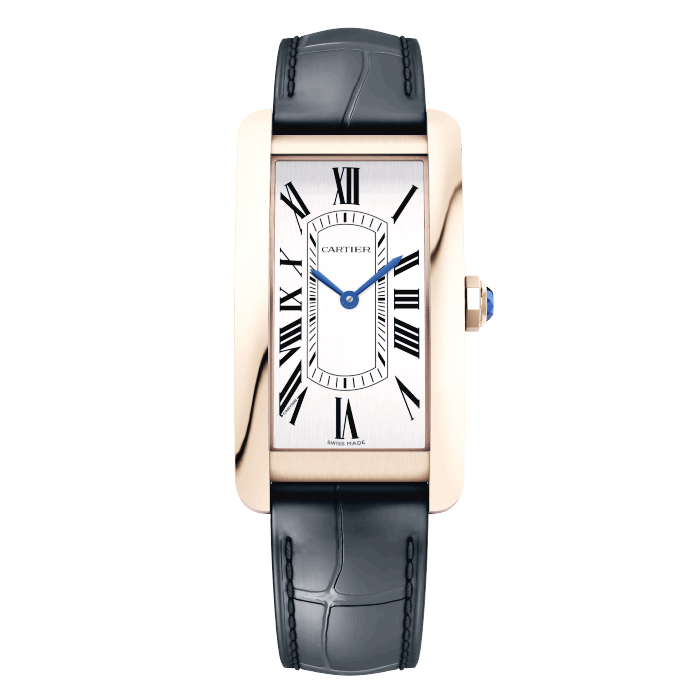 탱크 아메리칸 워치, small 모델, 쿼츠 무브먼트. 750/1000 핑크 골드 케이스, 사파이어 1개가 세팅된 각면 크라운. 새틴 브러시드 실버 마감 다이얼, 검 모양의 블루 스틸 핸즈, 사파이어 글래스. 다크 브라운 샤이니 앨리게이터 가죽 스트랩, 750/1000 핑크 골드 아르디옹 버클. 케이스 크기: 35.4mm x 19.4mm, 두께: 6.8mm. 3bar(약 30m) 방수.