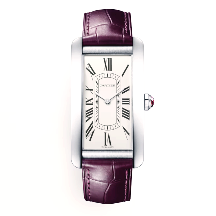 탱크 아메리칸 워치, 라지(large) 모델, 오토매틱 와인딩 메캐니컬 무브먼트. 950/1000 플래티늄 케이스, 각면 루비 1개를 세팅한 각면 크라운. 에그쉘 마감의 그레인 다이얼, 검 모양 실버 스틸 핸즈, 사파이어 글래스. 세미-매트 버건디 앨리게이터 가죽 스트랩, 교체 가능한 750/1000 화이트 골드 디플로이언트 버클. 케이스 크기: 44.4mm x 24.4mm, 두께: 8.6mm. 3bar(약 30m) 방수.