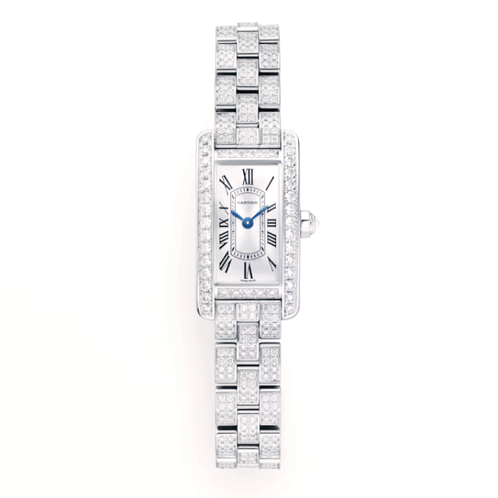 탱크 아메리칸 워치, mini 모델, 쿼츠 무브먼트. 총 0.69캐럿의 브릴리언트 컷 다이아몬드 41개가 세팅된 750/1000 화이트 골드 케이스 및 각면 크라운. 실버 마감 태양 광선 모티프 다이얼, 검 모양의 블루 스틸 핸즈, 사파이어 글래스. 총 2.60캐럿의 브릴리언트 컷 다이아몬드 528개가 세팅된 750/1000 화이트 골드 스트랩, 750/1000 핑크 골드 아르디옹 버클. 케이스 크기: 28mm x 15.2mm, 두께: 6.5mm. 3bar(약 30m) 방수.