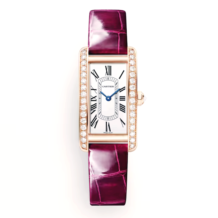 탱크 아메리칸 워치, small 모델, 쿼츠 무브먼트. 총 0.96캐럿의 브릴리언트 컷 다이아몬드 33개가 세팅된 750/1000 핑크 골드 케이스 및 각면 크라운. 새틴 브러시드 실버 마감 다이얼, 검 모양의 블루 스틸 핸즈, 사파이어 글래스. 샤이니 레드 앨리게이터 가죽 스트랩, 750/1000 핑크 골드 아르디옹 버클. 케이스 크기: 35.4mm x 19.4mm, 두께: 6.8mm. 3bar(약 30m) 방수.