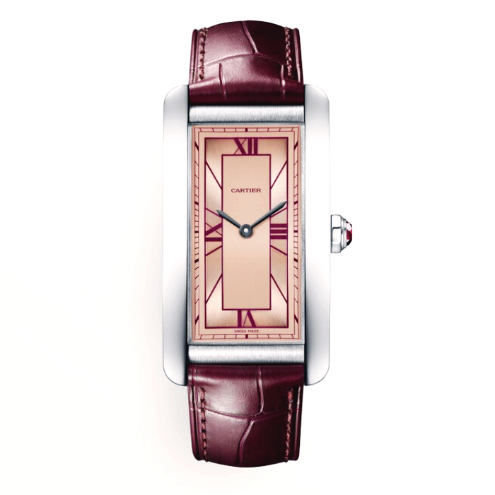 탱크 아메리칸 워치, 라지(large) 모델, 오토매틱 와인딩 메캐니컬 무브먼트. 950/1000 플래티늄 케이스, 각면 루비 1개를 세팅한 각면 크라운. 아르데코 애니메이션을 더한 살몬 컬러 다이얼, 검 모양의 로듐 도금 스틸 핸즈, 사파이어 글래스. 세미-매트 버건디 앨리게이터 가죽 스트랩, 교체 가능한 750/1000 화이트 골드 디플로이언트 버클. 케이스 크기: 44.4mm x 24.4mm, 두께: 8.6mm. 3bar(약 30m) 방수.