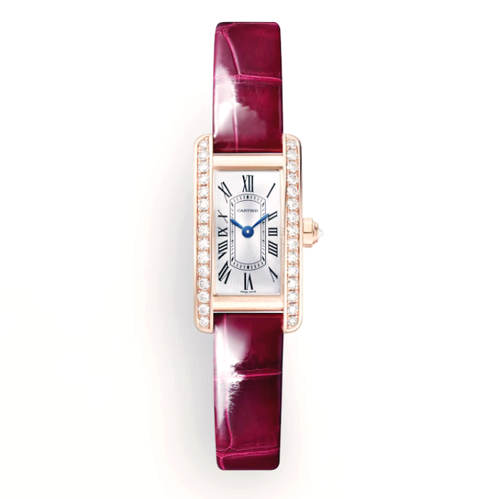 탱크 아메리칸 워치, mini 모델, 쿼츠 무브먼트. 총 0.55캐럿의 브릴리언트 컷 다이아몬드 31개가 세팅된 750/1000 핑크 골드 케이스 및 각면 크라운. 실버 마감 태양 광선 모티프 다이얼, 검 모양의 블루 스틸 핸즈, 사파이어 글래스. 샤이니 레드 앨리게이터 가죽 스트랩, 750/1000 핑크 골드 아르디옹 버클. 케이스 크기: 28mm x 15.2mm, 두께: 6.5mm. 3bar(약 30m) 방수.