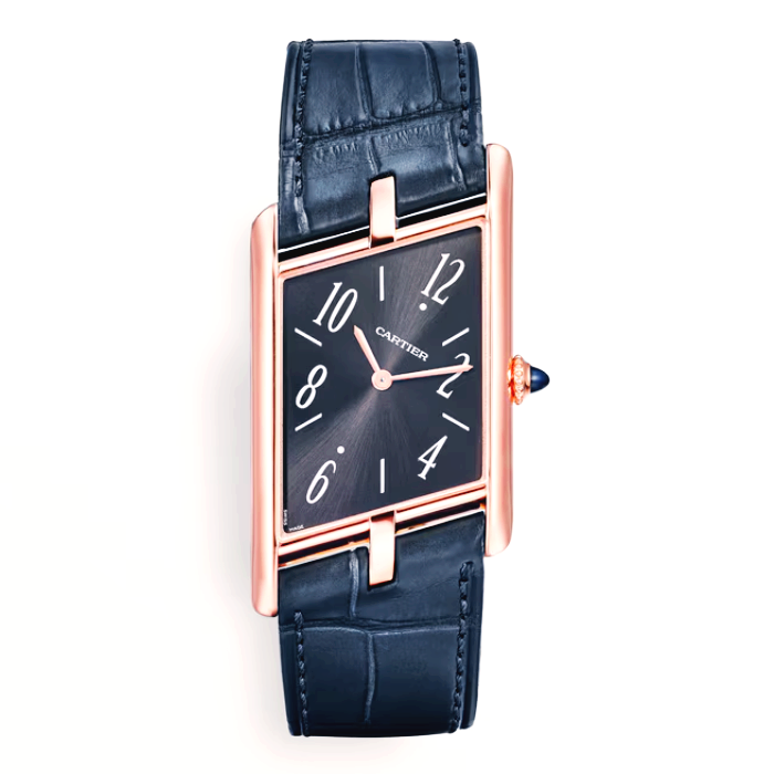 탱크 아시메트리크 워치, 까르띠에 매뉴팩처 매뉴얼 와인딩 메케니컬 무브먼트, 1917 MC 칼리버. 18K 핑크 골드 케이스, 사파이어 1개가 세팅된 비즈 크라운, 그레이 다이얼, 검 모양의 골드톤 핸즈, 다크 그레이 앨리게이터 가죽 스트랩, 18K 핑크 골드 아르디옹 버클. 케이스 사이즈: 47.15mm x 26.10mm, 두께: 6.38mm. 고유번호가 부여된 100피스 리미티드 에디션. 3bar(약 30m) 방수.