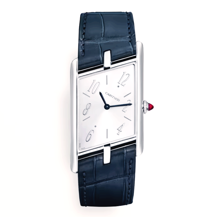 탱크 아시메트리크 워치, 까르띠에 매뉴팩처 매뉴얼 와인딩 메캐니컬 무브먼트, 1917 MC 칼리버. 950/1000 플래티늄 케이스, 루비 1개가 세팅된 비즈 크라운, 실버 다이얼, 검 모양의 블랙 스틸 핸즈, 다크 그레이 세미-매트 앨리게이터 가죽 스트랩, 950/1000 플래티늄 아르디옹 버클. 케이스 사이즈: 47.15mm x 26.10mm, 두께: 6.38mm. 고유번호가 부여된 100피스 리미티드 에디션. 3bar(약 30m) 방수.