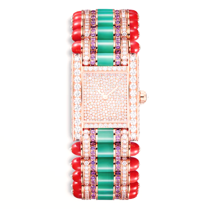 탱크 주얼리 워치, 라지(large) 모델, 쿼츠 무브먼트. 총 6.51캐럿 브릴리언트 컷 다이아몬드 348개, 아메시스트, 산호, 크리소프레이즈를 세팅한 750/1000 핑크 골드 케이스 및 브레이슬릿, 총 3.06캐럿 브릴리언트 컷 다이아몬드 155개를 세팅한 750/1000 핑크 골드 베젤, 0.10캐럿 다이아몬드 1개를 세팅한 크라운, 총 0.82캐럿 브릴리언트 컷 다이아몬드 272개를 세팅한 750/1000 핑크 골드 다이얼, 검 모양의 레드 폴리싱 핸즈. 케이스 직경: 31 x 24.2mm, 두께: 6.75mm. 3bar(약 30m) 방수.