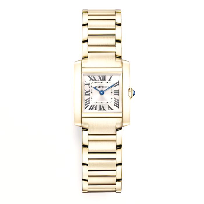 탱크 프랑세즈 워치, small 모델, 쿼츠 무브먼트. 총 0.78캐럿의 브릴리언트 컷 다이아몬드 23개가 세팅된 750/1000 옐로우 골드 케이스와 각면 크라운. 골드 태양 광선 모티프 다이얼, 검 모양의 블루 스틸 핸즈, 사파이어 글래스. 750/1000 옐로우 골드 브레이슬릿. 케이스 크기: 25.7mm x 21.2mm, 두께: 6.8mm. 3bar(약 30m) 방수.