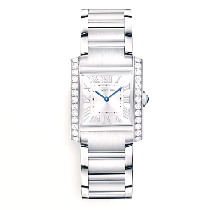 탱크 프랑세즈 워치, medium 모델, 쿼츠 무브먼트. 총 1.09캐럿의 브릴리언트 컷 다이아몬드 26개가 세팅된 스틸 케이스, 카보숑형 합성 블루 스피넬 1개가 세팅된 스틸 각면 크라운. 실버 마감 태양 광선 모티프 다이얼, 검 모양의 블루 스틸 핸즈, 사파이어 글래스. 스틸 브레이슬릿. 케이스 크기: 32mm x 27mm, 두께: 7.1mm. 3bar(약 30m) 방수.