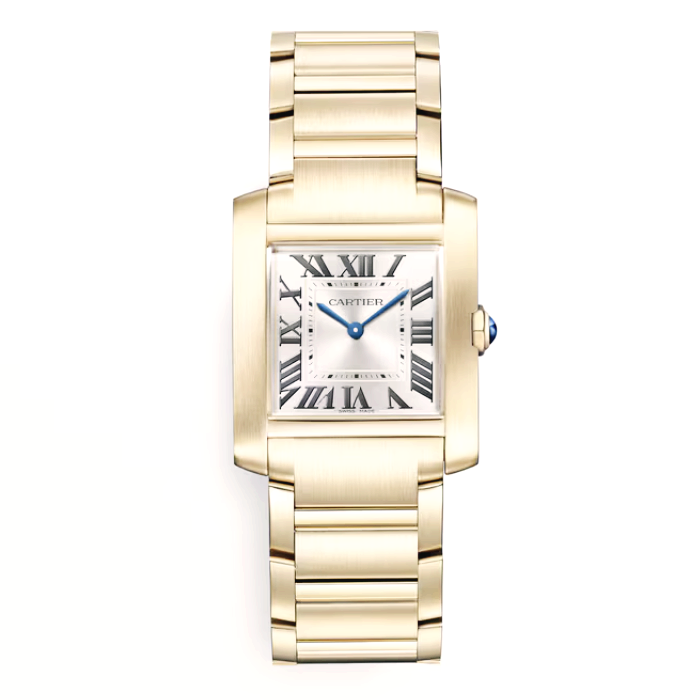 탱크 프랑세즈 워치, medium 모델, 쿼츠 무브먼트. 750/1000 옐로우 골드 케이스. 사파이어 카보숑이 장식된 750/1000 옐로우 골드 각면 크라운. 골드 태양 광선 모티프 다이얼, 검 모양의 블루 스틸 핸즈, 사파이어 글래스. 750/1000 옐로우 골드 브레이슬릿. 크기: 32mm x 27mm, 두께: 7.1mm. 3bar(약 30m) 방수.
