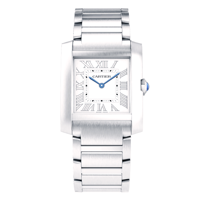 탱크 프랑세즈 워치, medium 모델, 쿼츠 무브먼트. 스틸 케이스. 카보숑형 합성 스피넬이 장식된 스틸 각면 크라운. 실버 마감 다이얼, 검 모양의 블루 스틸 핸즈, 사파이어 글래스. 스틸 브레이슬릿. 케이스 크기: 32mm x 27mm, 두께: 7.1mm. 3bar(약 30m) 방수.